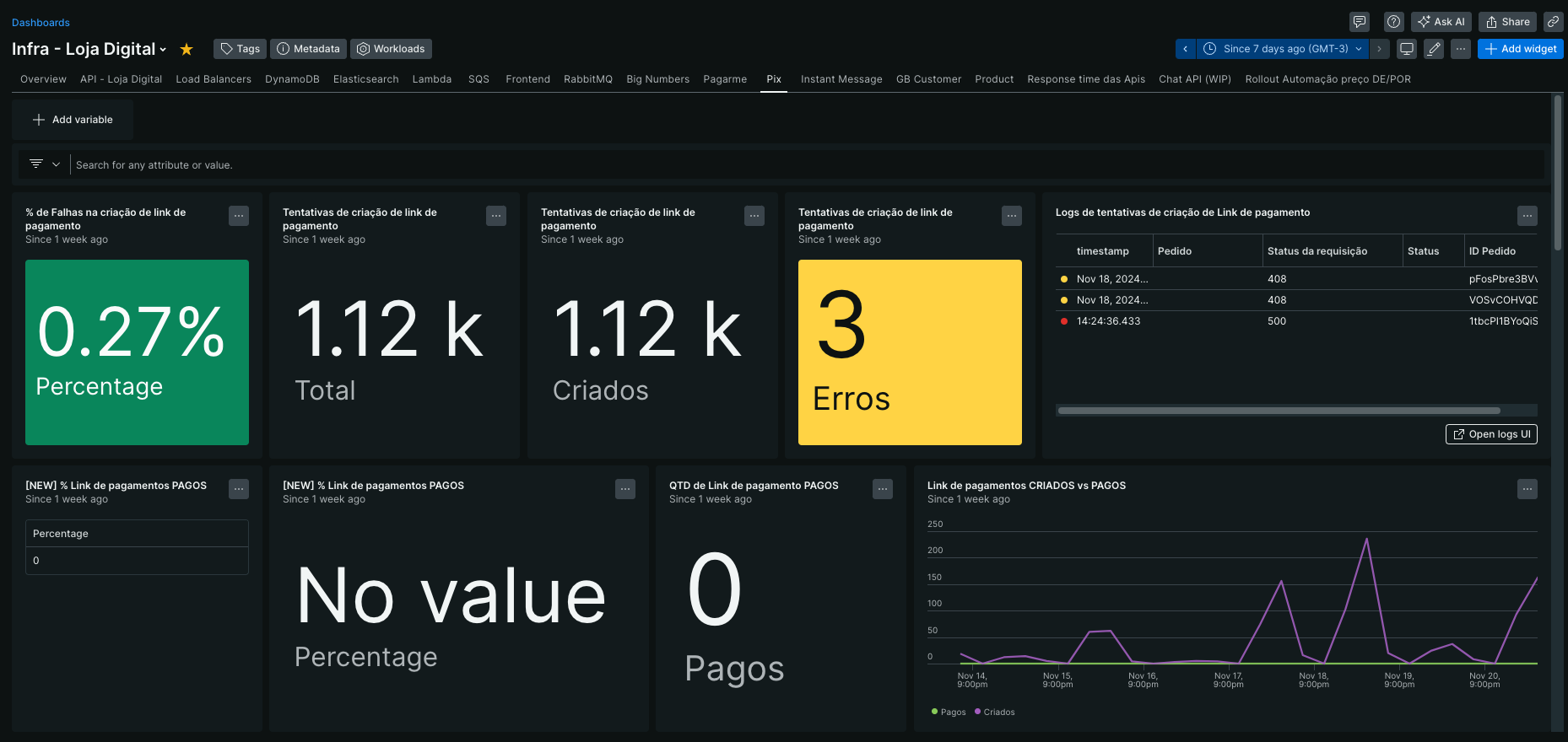 Criei então junto com o time, um dashboard de acompanhamento específico para a entrega de Pix. Além do dashboard criamos alertas em caso de erros em algum fluxo do Pix.